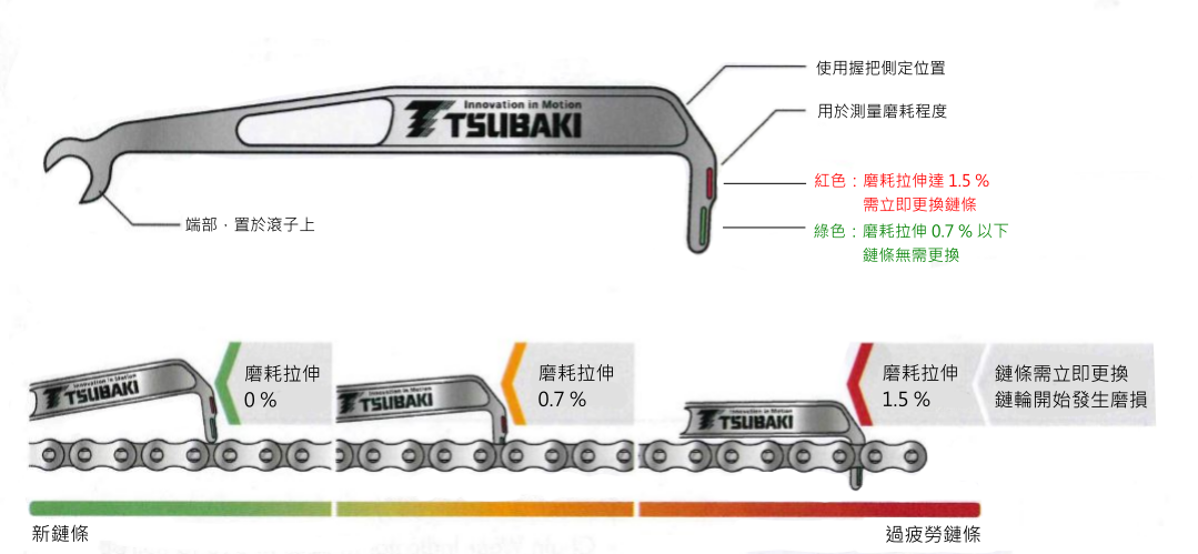 • 經(jīng)常檢測鏈條磨耗拉伸率,適時安排保養(yǎng)行程